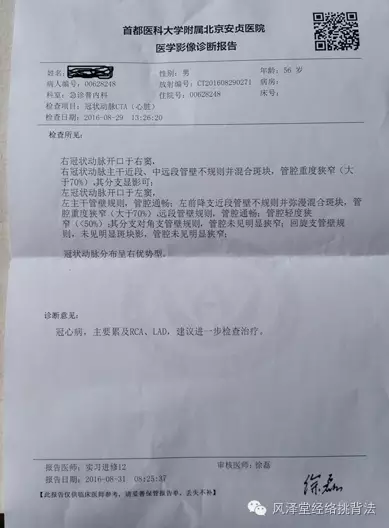 2016年9月1日,29日才检查出来专家自己的冠心病,专家夫人奋战一个晚上网络查资料寻找到了北京风泽堂,觉得靠谱,早晨起来直接打电话后当即驱车来到风泽堂,交流10分钟当场决定接受风泽堂抽丝疗法治疗,当时正在治疗一位贵阳的冠心病患者与湖南的肺气肿患者,因无预约,故约定第二天下午来风泽堂。